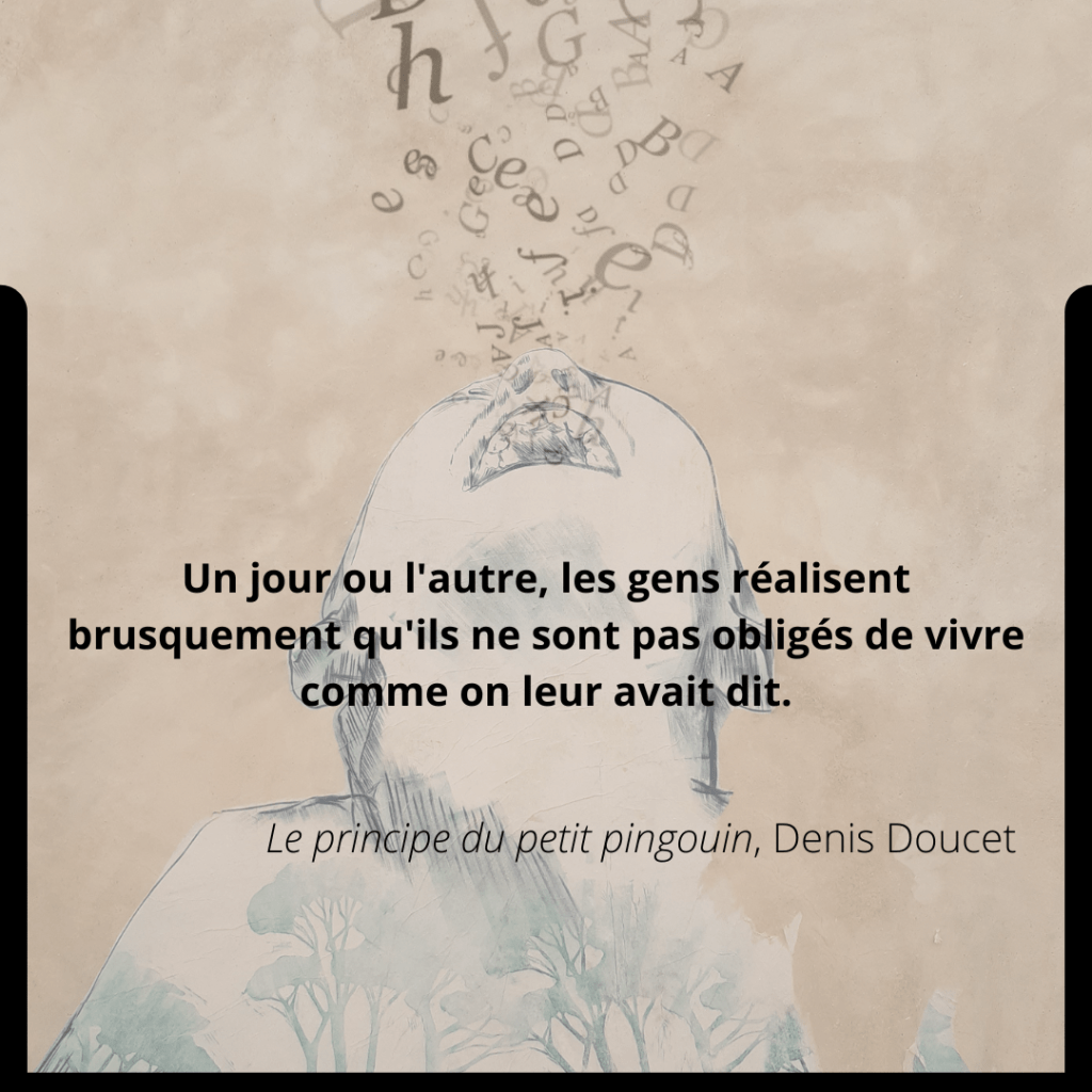N.B : Le psychologue Denis Doucet s’interroge sur ce point : « Souffrons-nous d’une incapacité à nous adapter à notre milieu et aux autres ? Peut-être pas, répond-il. Peut-être que ce qui nous est demandé est absurde. Peut-être que nous sommes captifs d’une logique insensée. Peut-être que nous perdons notre temps à nous ajuster à ce qui nous entoure, alors qu’il vaudrait mieux agir pour changer les choses ».