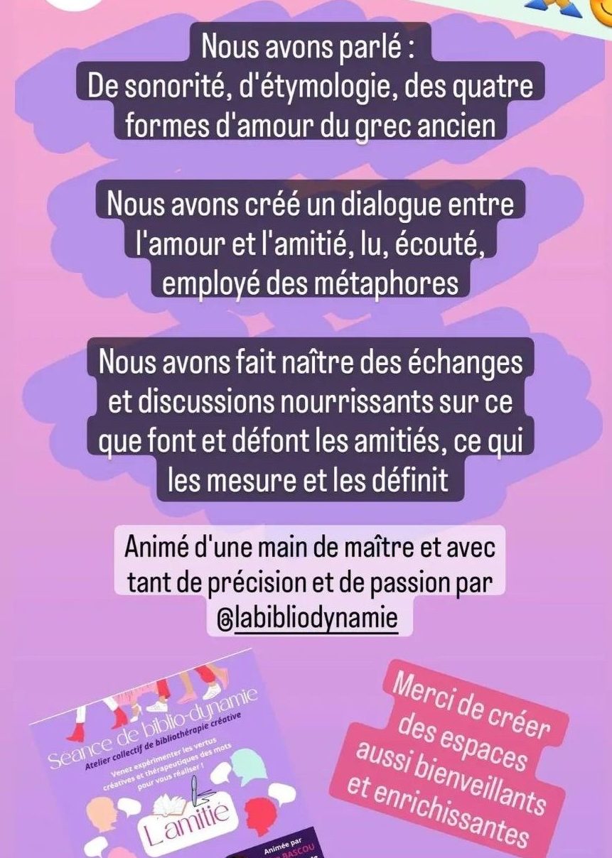 - Présentation théorique et pratique des outils bibliothérapeutiques à destination de différents publics (jeunesse, adultes, retraités);